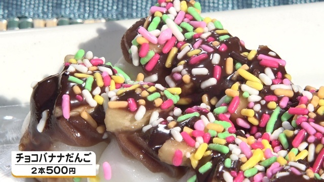 他にも、チョコレートとバナナを乗せた「チョコバナナだんご」(2本500円)や…。