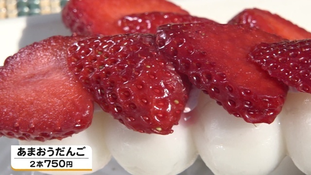 だんごの上に生クリームとイチゴを盛った「あまおうだんご」(2本750円)もあります。