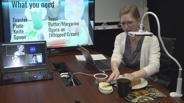 どのようなものなのか、再現してもらいます。「まずはバターをトーストに…」。エリザベスさんは、小倉トーストを食べたことがない名古屋在住のフランス人の女性に、オンラインで小倉トーストの作り方を説明。