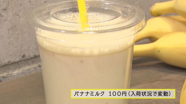 店の一番人気は、「バナナミルク」(100円)。熟したバナナと牛乳だけで作ったフルーティーなジュースです。価格は、入荷次第で変動しますが、かなりお値打ちです。