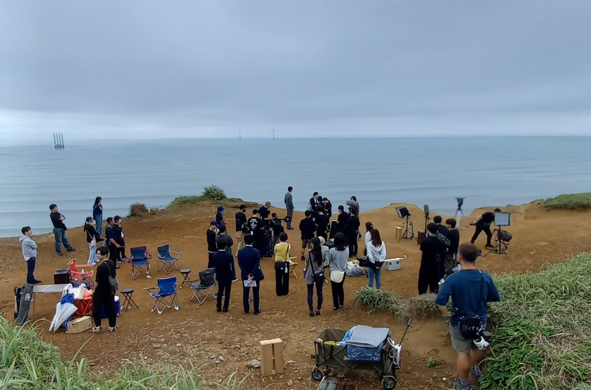 午前は小雨もパラつく様相だった現場も、昼過ぎからは雲が切れ、陽もさすようになってきた。昼食休憩をはさみ、カフェ・カーでおいしい飲み物も堪能できて、現場のスタッフ達の表情も明るくなる。天気のせいだけでなく、この日のロケは、いつもの撮影とは違う、開放的な空気感に包まれていた。 というのも、この日は「熱護たちが崖で撮影を行っているという設定」での撮影だったのだ。