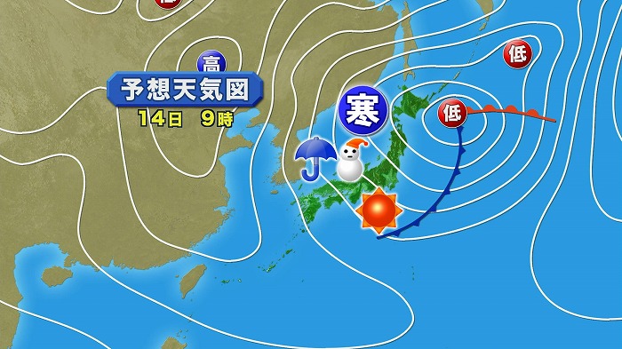 明日の予想天気図です。西高東低冬型の気圧配置が深まります。上空に寒気も入り日本海側で大気が非常に不安定に、太平洋側はおおむね晴れ。