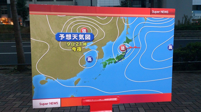 今夜9時の予想天気図です。東海3県、台風24号から変わった温帯低気圧から伸びる寒冷前線が掛かり今夜9時くらいまでは雨が降りやすい状況です。