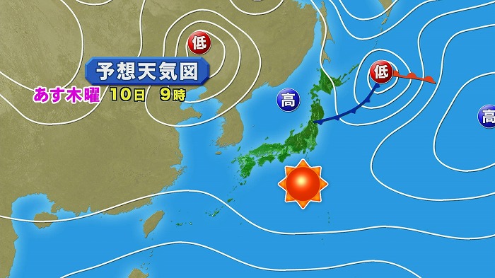 明日午前9時の予想天気図です。高気圧に覆われて日差し戻り晴れて昇温します。すでに次の低気圧が控え、明後日は雨に。