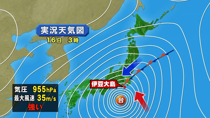 午前3時の実況天気図です。台風26号の中心気圧は955hPa、最大風速は35m/sで強い勢力を維持していました。台風を回る暖湿気と台風に吹き込む北東風が収束して前線を形成し、活発に雨雲が発生しました。上陸しなかったので水蒸気の補給も断たれず、地面摩擦にも邪魔されず勢力が衰えませんでした。伊豆大島では午前4時までの2時間で236.5ミリと猛烈な雨に。