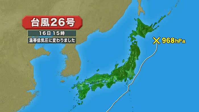 台風26号は午後3時に温帯低気圧に変わりました。「温低化」=「安心安全」ではありません。中心気圧は968hPaと勢力衰えていません。温低化すると速やかに予報円(この場合は現在の強風域や暴風域など)を削除する気象庁にも問題があるように思います。今年の17号然りです。以前、某マスコミから「気象庁は台風が温低化しているのに嘘を付いて台風として発表している」と追及されたのが応えたのでしょうか。温低化表記した上で予報円も記せばこれまで通りで、簡単に上手く解決ですのに。