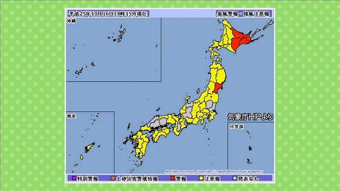 18:15現在でも、全国広い範囲で強風注意報・暴風警報が発表中で、元台風の影響を物語ります。
