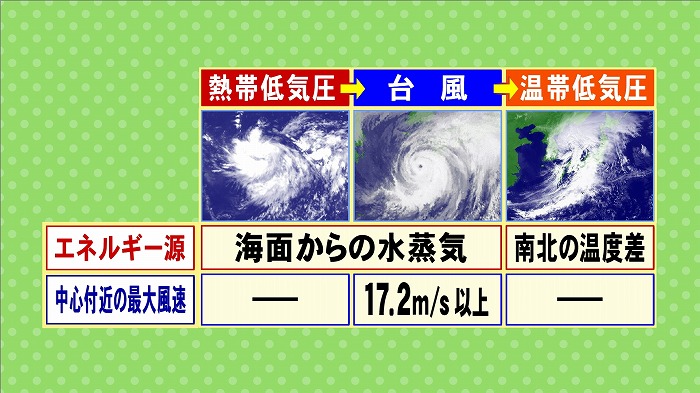 台風と温帯低気圧はどう違うのか。衛星雲画像、台風は同心円状で目を伴うことが多い、温低は楕円形やコンマ型で前線を伴う。熱低と台風のエネルギー源は海面からの水蒸気、水蒸気が雲になると周囲を温めてさらに上昇気流強化、気圧下がって積乱雲の渦が出来ます。温低は南北の温度差から、それを解消しようと渦が出来るわけです。いずれも北半球は反時計回りの渦になります。中心付近の最大風速、熱帯低気圧の所に「17.2m/s未満」と書いた方がわかりやすかったですね、すいません。台風の卵、熱低の最大風速が17.2m/sとなると「台風」と呼ばれます。温低は必ずしも台風から変わるわけではありませんが、変わった場合、最大風速は関係ありません。エネルギー源が変わるだけであって、構造の変化、風速は大きくなる場合もありうるのです。