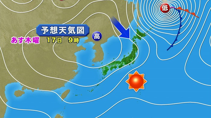 最後に明日午前9時の予想天気図です。移動性高気圧に覆われて東海3県晴れ。寒気の影響で朝晩はひんやり。北日本の日本海側中心に雨、標高高い所は雪も。ではまた明日!