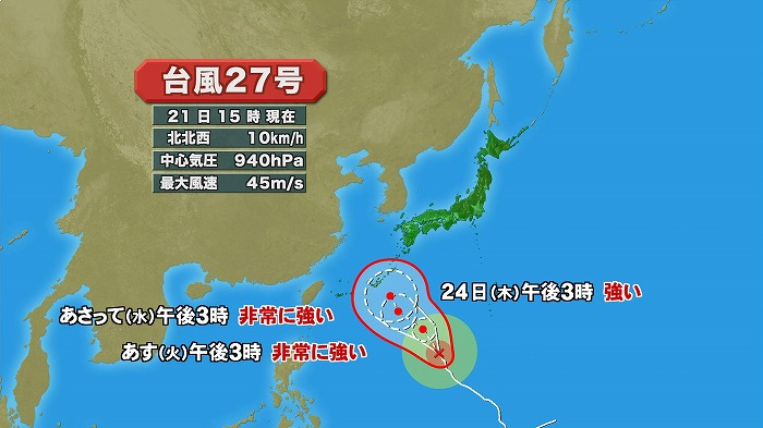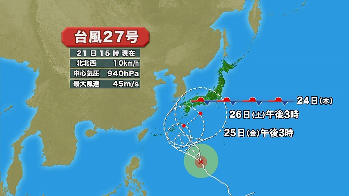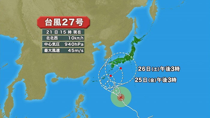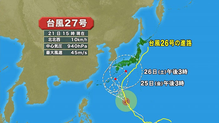 甚大な被害をもたらした台風26号よりも本州よりを進む可能性があります。東海地方への影響が26号時より大きくなるかもしれません。