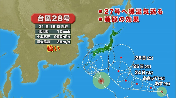 そして、強い台風28号も発生しています。東海地方へ直接影響無さそうですが、土曜に2つの台風が接近する予想です。28号から27号へと暖湿気が送られて雨雲が活発になったり、藤原の効果といって2つの台風が相互作用で複雑な進路を取る可能性があります。1921年、当時の中央気象台所長だった藤原咲平さんが提唱したのでこの名が付きました。