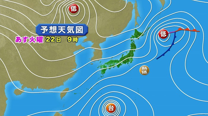 最後に明日午前9時の予想天気図です。周囲に低気圧、東海3県は相対的に気圧の高いエリアで、日中晴れ間あり、湿った空気の影響で朝晩は雲が広がりやすい。三重県南部中心に夜遅く雨が降りやすくなりそうです。ではまた明日!
