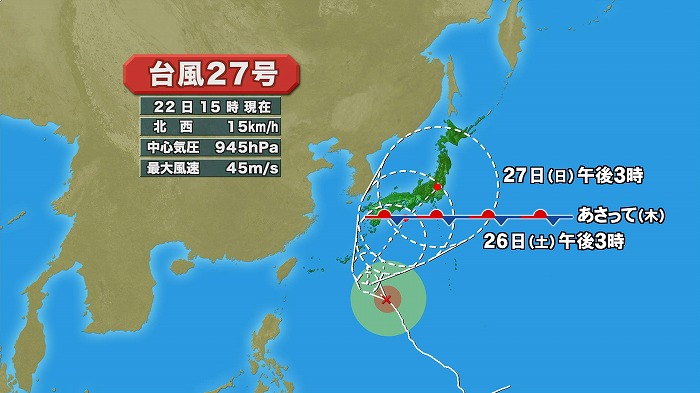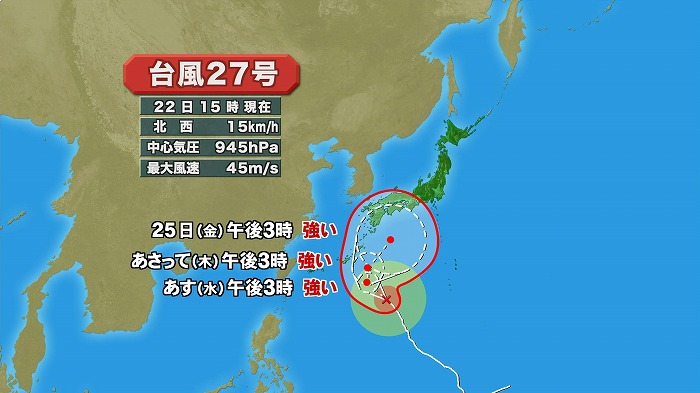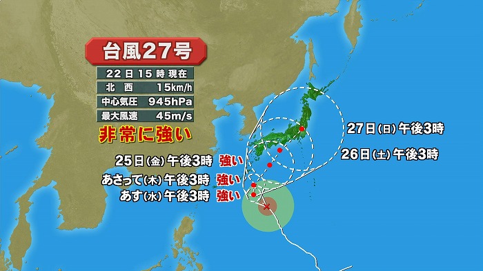台風の最新情報は気象庁HPで入手願います。非常に強い台風27号。