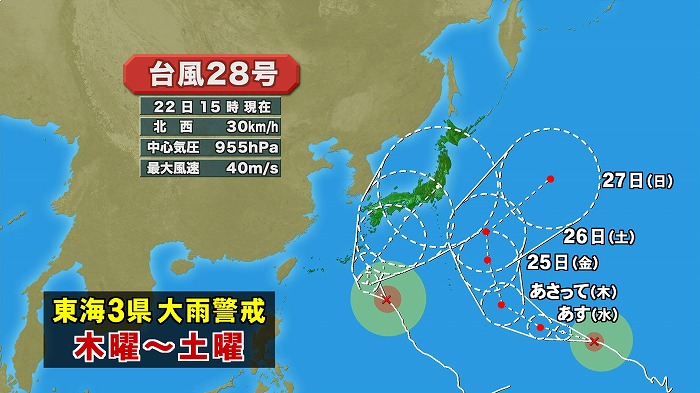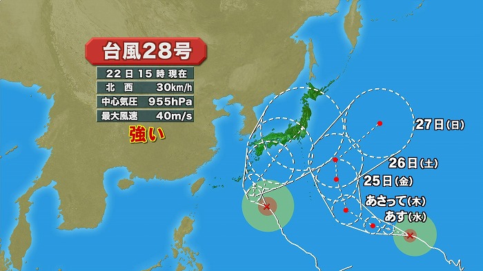 金曜まで強い勢力で北上の予想。木曜までの予報円は小さく転向後の円はまだ大きい。木曜以降に予報安定するはず。