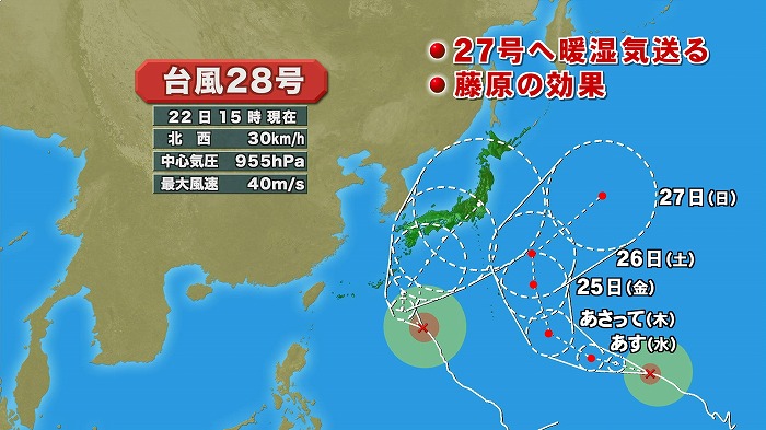 直接の影響なくても27号や前線へ暖湿気を送り発達させるおそれあり。予報円重なっているので藤原の効果で進路に影響する可能性も。予想速度を見ると、27号のスピードを抑えるかもしれない。遅いことによって長時間風雨にさらされることも。
