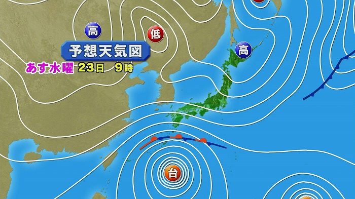 明日午前9時の予想天気図です。前線発生、九州、沖縄など西日本を中心に大雨の所も。東海3県は晴れ間もあって朝晩は雲が厚めで弱い雨の所も。ではまた明日!