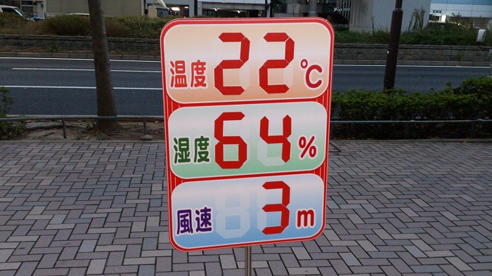 東海テレビ玄関前、午後5時頃のお天気ボードです。次第に風も強まり湿度も上がりつつあります。