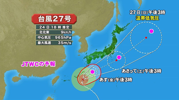 予報が安定してきたのか、気象庁が寄せているのか、JTWC(米海軍と米空軍の合同台風警報センター)の予報とほぼ同じです。中心だけを比べてしまうと、JTWCの方が少しスピードが速めです。いずれにせよスピードを上げる明日の予報円はもう少し小さくなるでしょう。