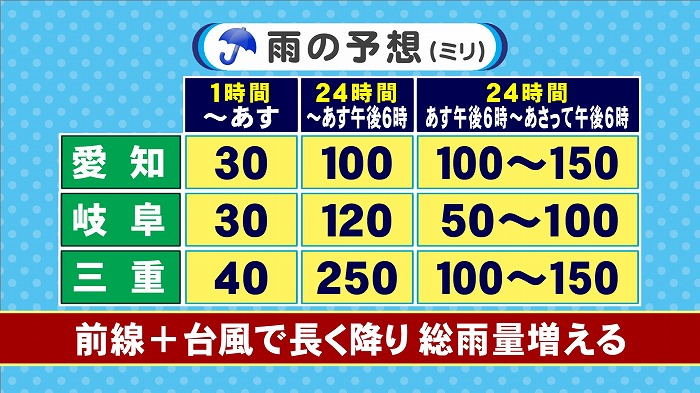 東海地方への最接近は土曜午前6時から9時頃となりそうです。暴風域は伴わず接近、強風には注意ですが、総雨量に警戒が必要となりそうです。