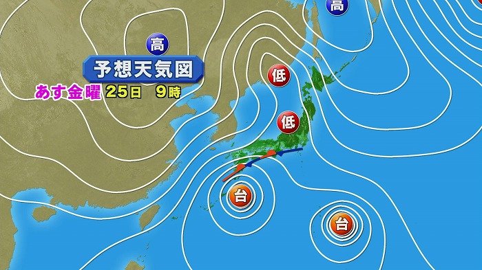 明日金曜午前9時の予想天気図です。長引く雨の原因は台風に先行する前線です。