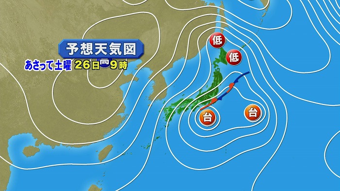 明後日土曜午前9時の予想天気図です。台風本体の雲も掛かって来そうです。明日は三重は一日雨、愛知と岐阜も午後から本降りに。避難路や避難所、ハザードマップ、非常持出袋などの確認をしておきましょう。ではまた明日!