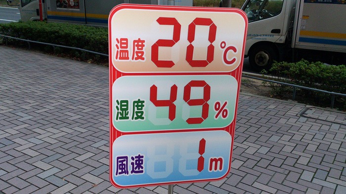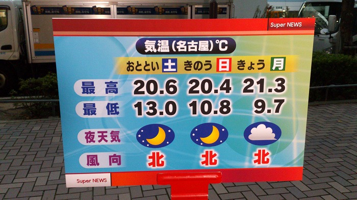 東海テレビ玄関前、午後5時頃のお天気ボードです。ひんやりした空気を実感。