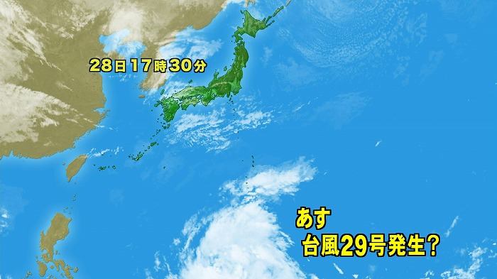 フィリピンの東海上で熱帯低気圧の雲がまとまっています。明日には台風29号発生の予想です。