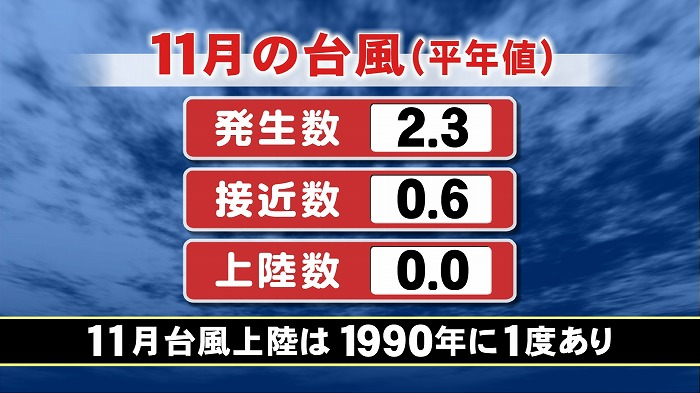 まだ10月ではありますが、11月台風の平年値です。上陸数は「0.0」。0ではなく0.0です。これは限りなく0に近いが0ではないのです。11月の台風上陸は、1951年からの統計以降1990年11月30日和歌山県白浜町、過去1回だけあるのです。
