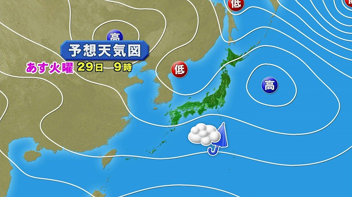 明日火曜午前9時の予想天気図です。高気圧中心が東に抜けて、上空の気圧の谷が接近、湿った空気が入って雲が厚く、三重を中心に弱い雨が降りやすいでしょう。北陸や北日本の日本海側では急な雷雨の可能性も。