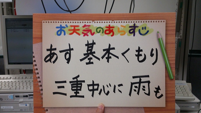 最後にお天気のあらすじです。明日は比較的気圧の低い所に覆われて基本曇り、三重中心に雨の所も。ではまた明日!