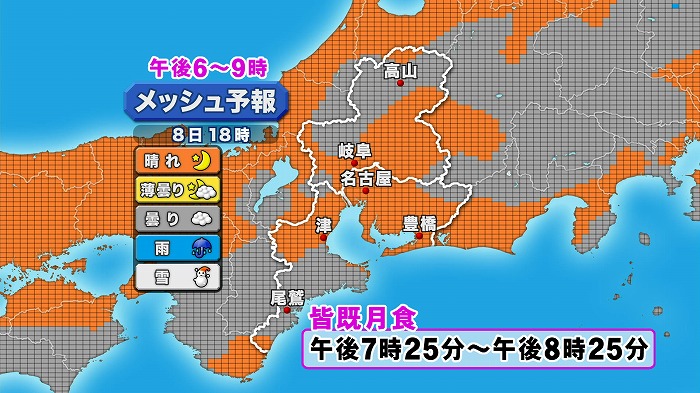 気になる天気ですが、三重南部や岐阜飛騨地方を中心に雲の広がりやすい所もありますが、皆既月食は1時間ありますので、雲の切れ間はあるはずです。各地、観察チャンスあるでしょう。