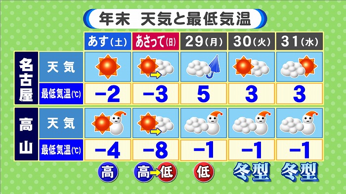 年末の天気と最低気温です。月曜低気圧が抜けてから冬型に。岐阜山間部は大雪に警戒。