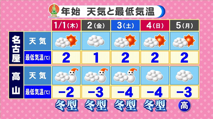 年始の天気と最低気温です。冬型続いて高山雪断続。名古屋晴れ間ありますが、元日朝は雪が降る可能性も。