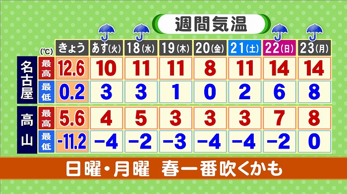 高山の最低気温はこの冬最も低い値でした。日中は春の陽気。金曜一時的に気温下がりますが、平年より高い日が多いでしょう。日曜・月曜は春一番が吹くかもしれません。春一番の条件は風速8m/s、平年より高い気温、日本海側に発達した低気圧があることです。