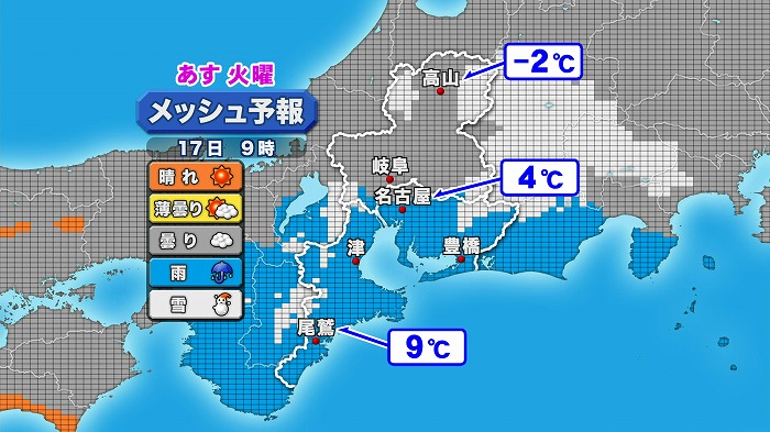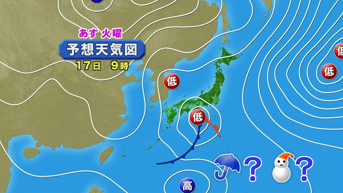明日火曜午前9時の予想天気図です。低気圧の影響で雨か雪かと降る時間はメッシュ予報でどうぞ。