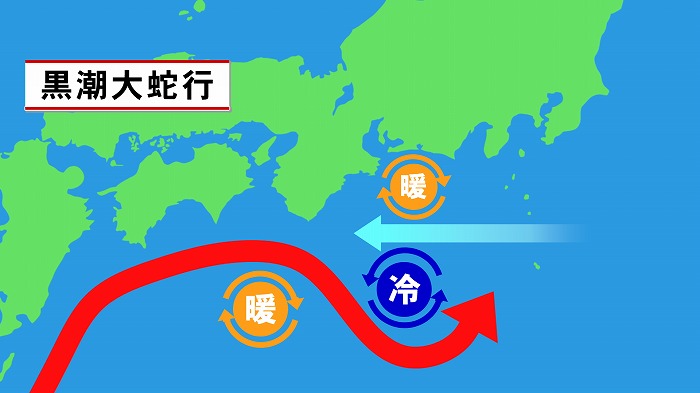 黒潮が大蛇行するとなぜ沿岸部の潮位が上がるのか。張り出した部分に時計回りの暖水、反時計回りの冷水が滞留します。東海沖の冷水の渦が西進する流れを作ります。その流れの北側には時計回りの暖水が集まるのです。