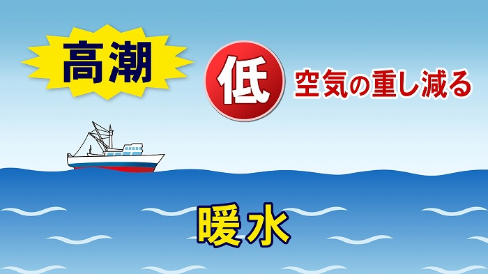 ここに台風を含む低気圧が接近すると、空気の重しが減るので、高潮が発生する危険性が高まるのです。