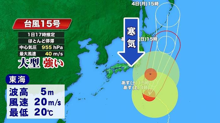東海3県はぎりぎり大型台風15号の強風域には入らない見込みですが、強い風と高い波に注意が必要です。海はしけ。20m/sの風が吹けば看板や屋根瓦が飛びます。そして、寒気の引き込みによる低温にも注意です。