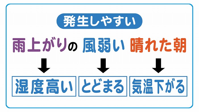 発生しやすいのは雨上がりの風弱い晴れた朝です。雨上がりは湿度が高く、風弱いと霧が留まり、晴れた朝は放射冷却で気温下がります。次は来週月曜に予想されます。