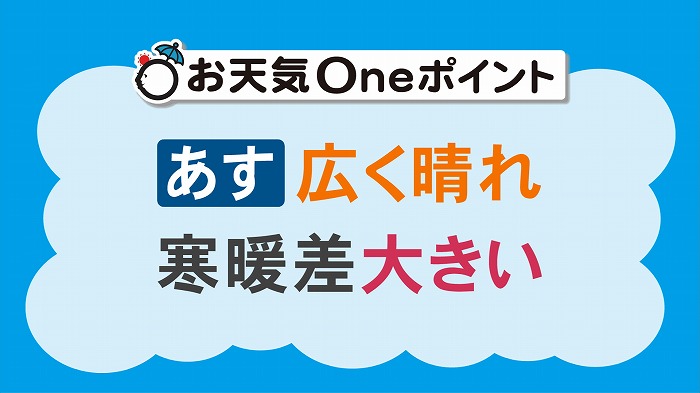 お天気Oneポイント!です。明日、広く晴れて寒暖差大きい。