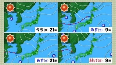週間予報です。熱中症警戒です。週明けは湿った空気の影響で雲が増えます。