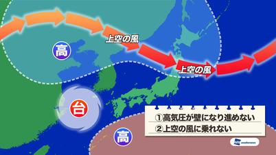 停滞の理由は高気圧の壁と偏西風に乗れないからです。