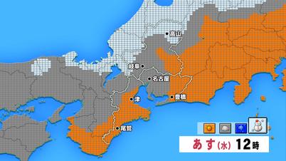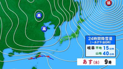 予想天気図です。岐阜県は明日明け方にかけて大雪に注意。愛知と三重も路面凍結注意。