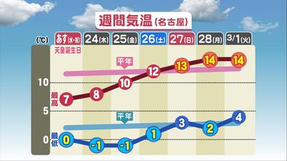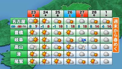 週間の予想気温です。真冬から春へ向かいます。花粉の飛散も本格化しそう。