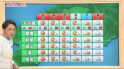 東海テレビ「スイッチ!」東海3県の天気。広く晴れ。