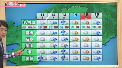 明日は三重南部で午前中雨。他は曇り。木曜日から金曜日と土曜日にかけてもしっかり雨の見込みです。