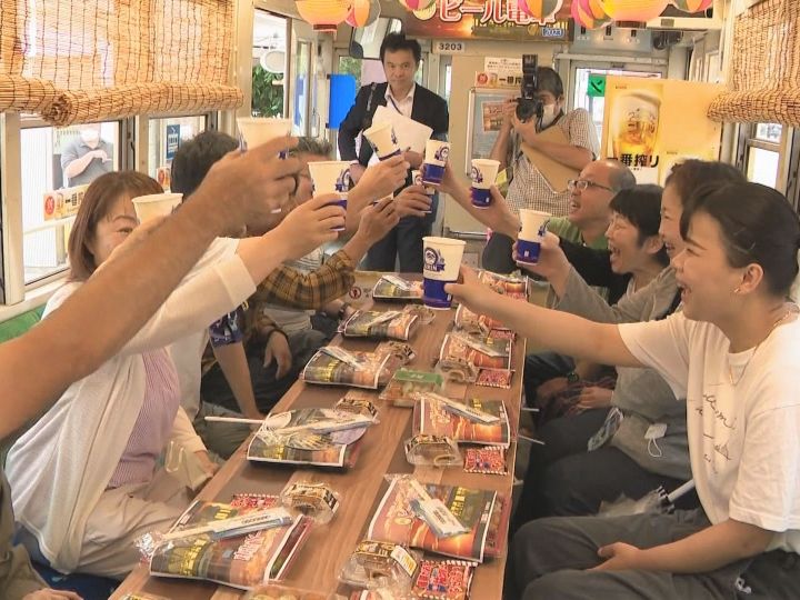 14日、ビール電車のシーズンインを前に試乗会が行われ、抽選に当たった市民らが電車に揺られながら、冷えた生ビールを片手に1時間半ほどの宴会を楽しみました。