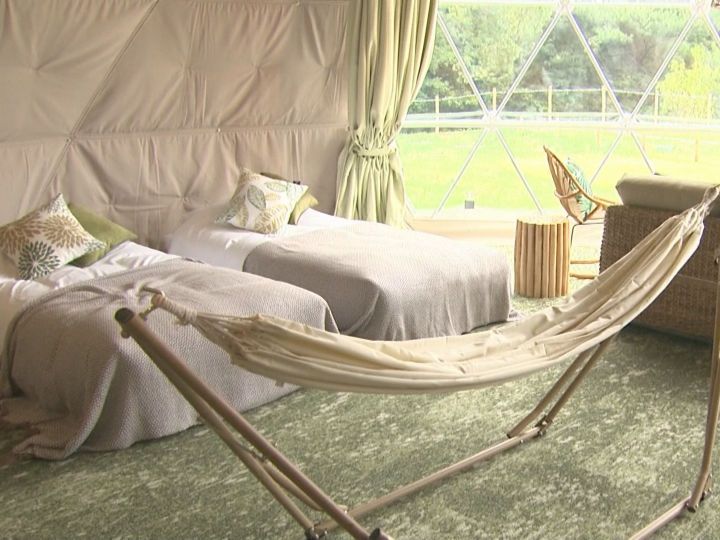 総面積109ヘクタールの敷地には、直径8メートルのグランピングテントがあり、テントの中は冷暖房も完備されていて、快適で何よりおしゃれです。