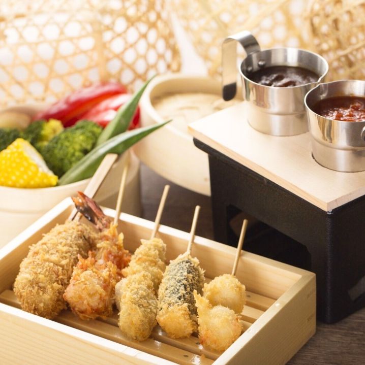 店の看板メニュー「串カツ」は、店で1本ずつ仕込んでいます。自家製タレが豊富で、名古屋らしい“八丁味噌”、“カレー”、“トマト”、“四川マーボー”、“おろしポンズ”があり、月替わりのタレもあります。
