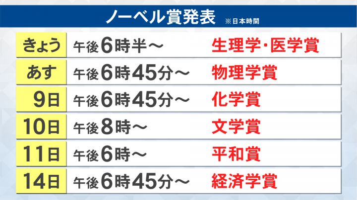 2024年の『ノーベル賞』各賞の発表スケジュール 7日の生理学・医学賞から14日の経済学賞まで 2024/10/07 18:19配信 2024年のノーベル賞の発表はきょう10月7日から始まります。各賞の発表スケジュールをまとめました。(時間は日本時間です) ・生理学・医学賞:7日午後6時半から ・物理学賞:8日午後6時45分から ・化学賞:9日午後6時45分から ・文学賞:10日午後8時から ・平和賞:11日午後6時から ・経済学賞:14日午後6時45分から 【動画で見る】「ノーベル賞ウィーク」始まる…東海3県で受賞が期待される研究者は?名城大に有力候補とされる教授陣
